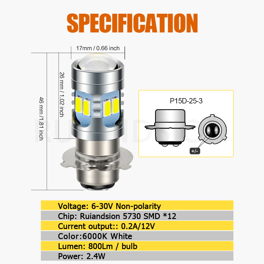 P26S / P15-25-3 Ultra Bright LED Motorcycle Bulb | 6-80V Wide Voltage | with Lens | 800 Lumens | Direct Halogen Replacement for Scooter Headlight